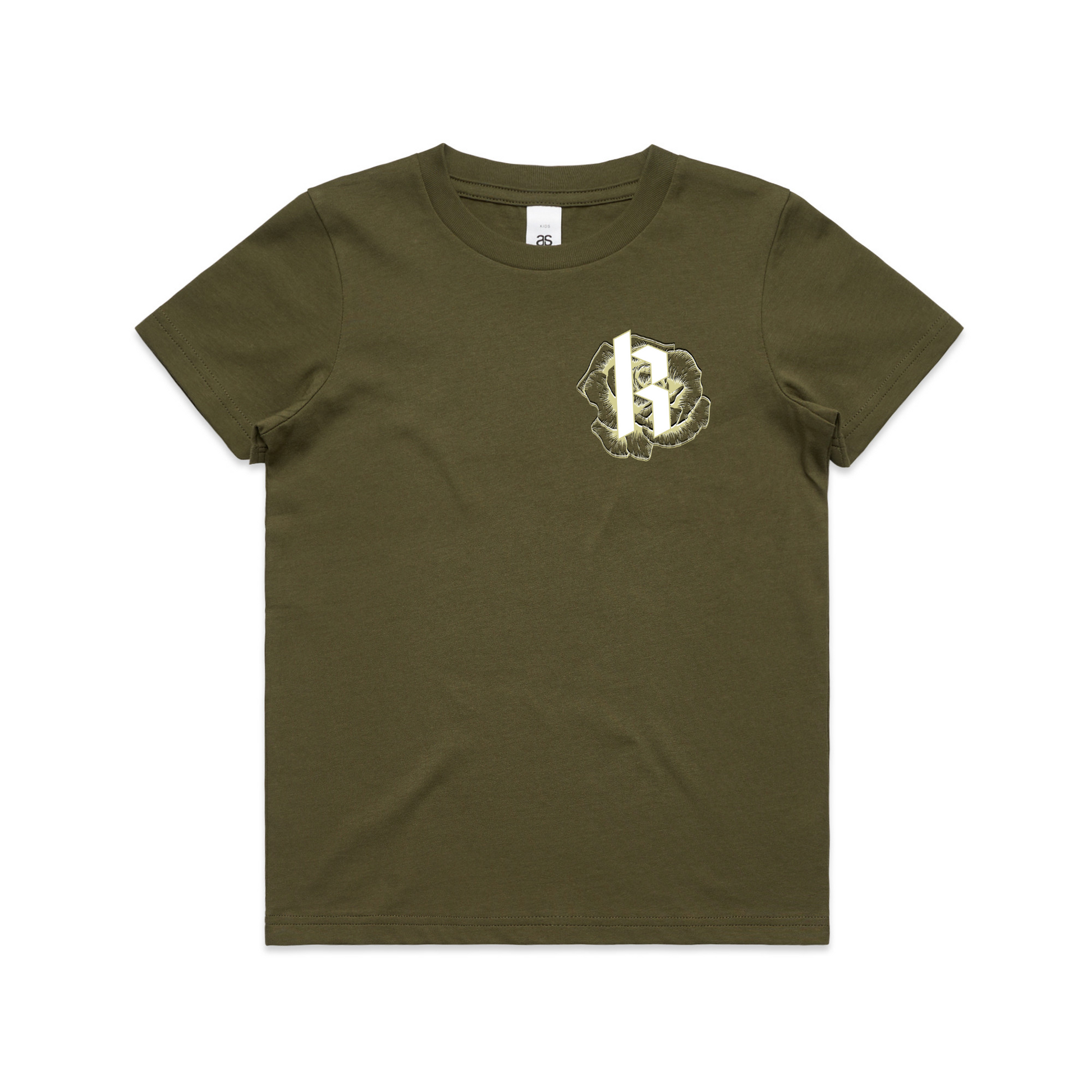 Large metallic rose/skull back piece. Small Metallic K/Rose logo design on the front - the gold being metallic.